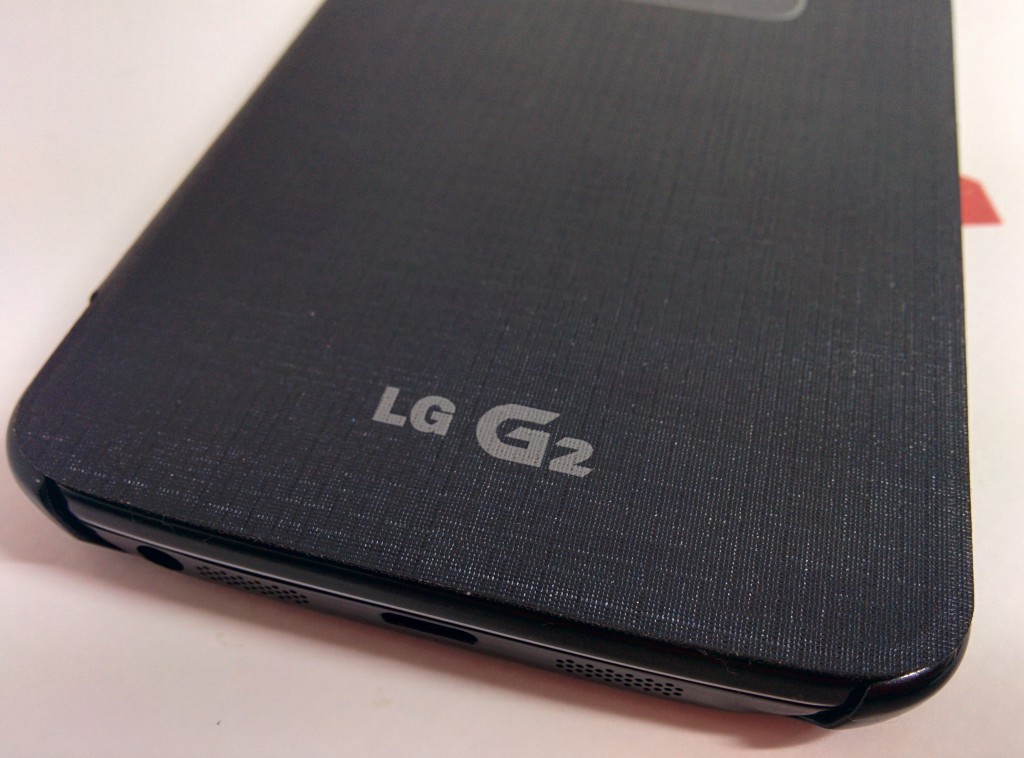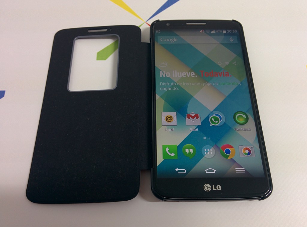 La funda Quick Window en sí, protege muy bien tanto la parte trasera como la delantera. La parte trasera diríamos que es de un material muy similar a la del LG G2, muy suave pero a la vez de un plástico que nos da mucha seguridad. La parte delantera en cambio, es de un material muy distinto, muy rugoso y que por dentro es como de terciopelo para agarrar bien la pantalla.