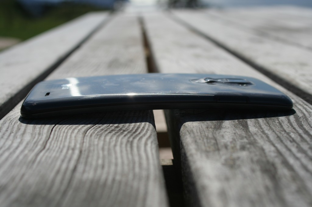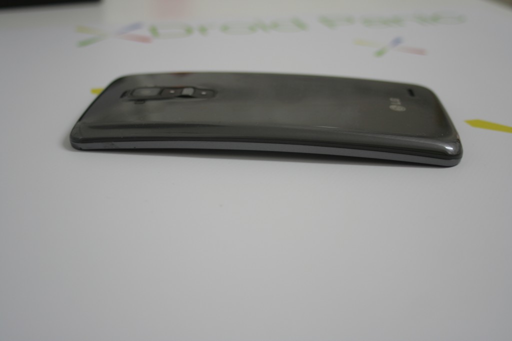 Este LG G Flex tiene unas dimensiones muy generosas, que comparándolas con el G2, parece enorme, pero comparando con otros dispositivos con pantallas de parecidas pulgadas es bastante compacto. Además, no solo en la pantalla radica su revolución, sino que su carcasa trasera también merece especial mención, ya que nos encontramos con una carcasa trasera que auto repara los pequeños daños o pequeños arañazos que vayan saliendo del uso. Avisamos de que no por tener esta carcasa se le van a quitar todos los desperfectos, pero sí que las disimulará en gran parte. Aún así, debemos decir y denunciar desde aquí que a nosotros nos ha llegado una unidad bastante tocada por las 4 esquinas fruto del mal uso que han hecho anteriores bloggers, por eso no podemos mostraros el dispositivo en su total esplendor sin rasguño alguno.