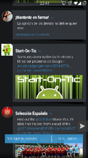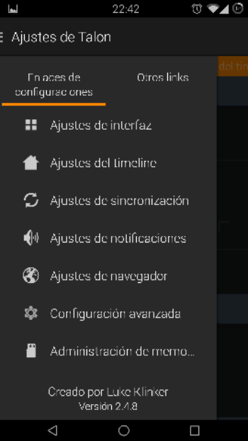 A parte de la configuración estética, que casino online realmente es amplia, dando lugar tanto a la posibilidad de crear temas tu mismo como descargarlos desde Play Store, posee una gran cantidad de opciones para configurar todo su rendimiento. Podemos modificar lo que queremos que se muestre en cada twitt, restringir el uso de memoria o incluso poder sincronizar una segunda cuenta. En general, su configuración es facil e intuitiva, el único aspecto negativo que le veo a este respecto, es la manera de proceder para sincronizar una segunda cuenta. Creo que debería ser mas sencillo e intuitivo, como el resto de la aplicación. También he echado en falta un visor de vídeos integrado, y la posibilidad de utilizar un navegador web distinto al de la aplicación, pero estoy seguro de que con alguna que otra actualización darán con la tecla
