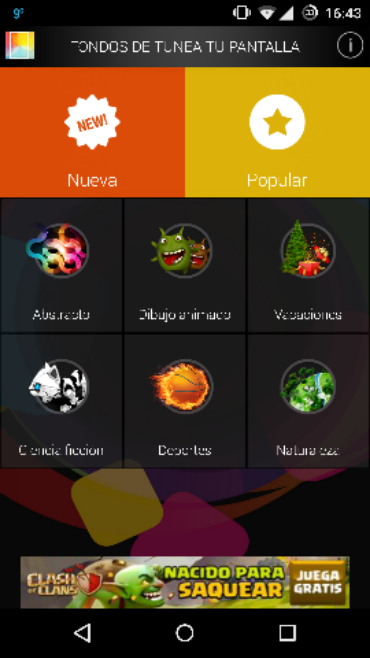 Fondos de pantalla, este es el nombre de la aplicación y parece que no se han roto mucho la cabeza con él, aunque originalidad no le falta en su interfaz. Simple pero vistosa, en la que veremos pinceladas del estilo Material Design implantado por Google y en la que encontraremos diferentes categorías de fondos de pantalla, así como las mas vistas o las mas usadas. Encotraremos fondos de lo mas variopinto, abstractos, deportes o dibujos animados son algunos ejemplos de sus categorías. Ademas, si damos un toque encima del fondo que queremos escoger, nos sobreimpresionará unos iconos para que nos hagamos una idea de como quedará finalmente.