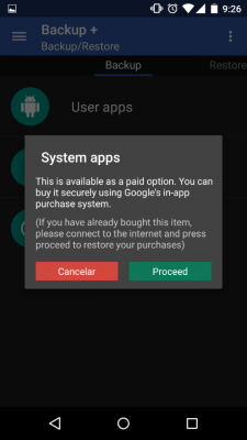 La aplicación en si es gratuita, pero con compras integradas. En la opción de hacer un backup de las aplicaciones del sistema, se nos exigirá el pago de una minúscula cantidad de 82 céntimos. Esta parte ya es a elección de cada uno, ya que no es imprescindible hacer una copia de seguridad de estas apps, ya que al instalar una nueva rom o al iniciar una restauración se fábrica de nuestro smartphone, vendrán ya pre-cargadas estas aplicaciones. Eso si, sin guardar los datos que tuviéramos en ellas.