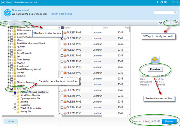 - Previsualización y elección de los archivos recuperados.
