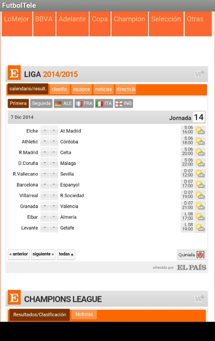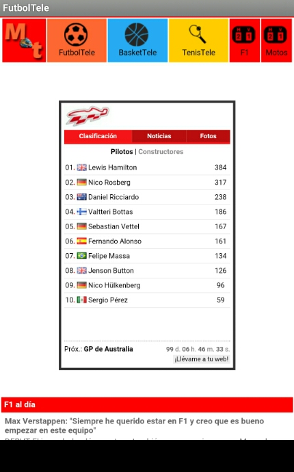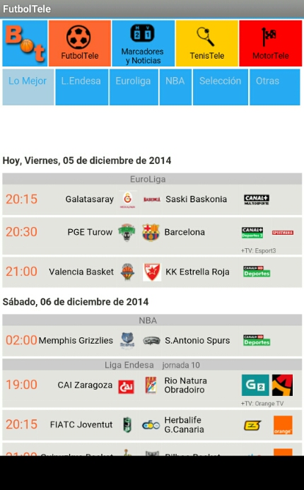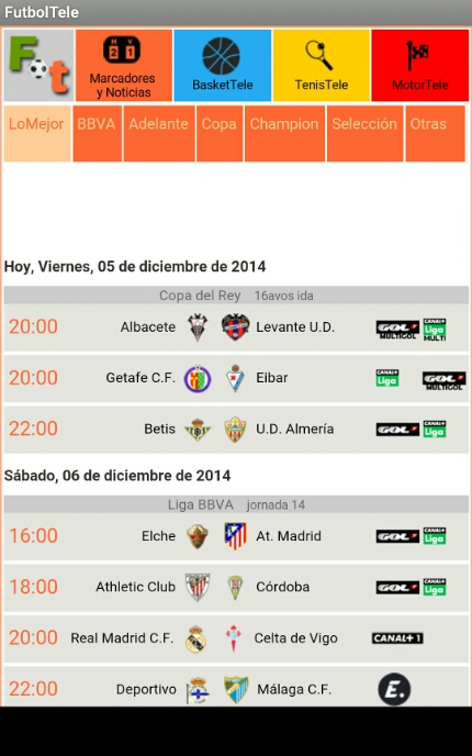 Para estar al tanto de los partidos, resultados en directo y algo de información, tenemos disponibles decenas de aplicaciones en Google Play, pero que además te diga por que canal lo televisan, muy pocas. Con FutbolTele, además de saber donde televisan el partido de tu equipo, te dará resultados en directo e información y noticias referentes al partido. Pero no queda aquí la cosa, ya que tendremos exactamente lo mismo para deportes como baloncesto, tenis o Formula 1.