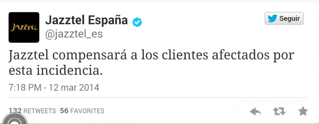 Como podemos ver en los tuits, Jazztel está trabajando en solucionar la caida, ya que a estas horas, todavía hay gente que no puede usar sus redes para comunicarse. Como parte de la solución, Jazztel ha decidido hacer un descuento de 5 euros en la factura de los clientes afectados, estiman que usarán alrrededor de 6 millones de euros para ello, algo que ayudará a tranquilizar a sus clientes, ya que han sido muchas las quejas recibidas y alguno de ellos, incluso ha solicitado su baja del servicio al no encontrar una solución. Esperemos que se solucione pronto y que los clientes de Jazztel pronto vuelvan a la normalidad. ¿Eres uno de los afectados? Cuentanos en que situación estás y que es lo que te ha comentado Jazztel, de esa manera ayudaremos al resto de usuarios de la compañía telefónica.